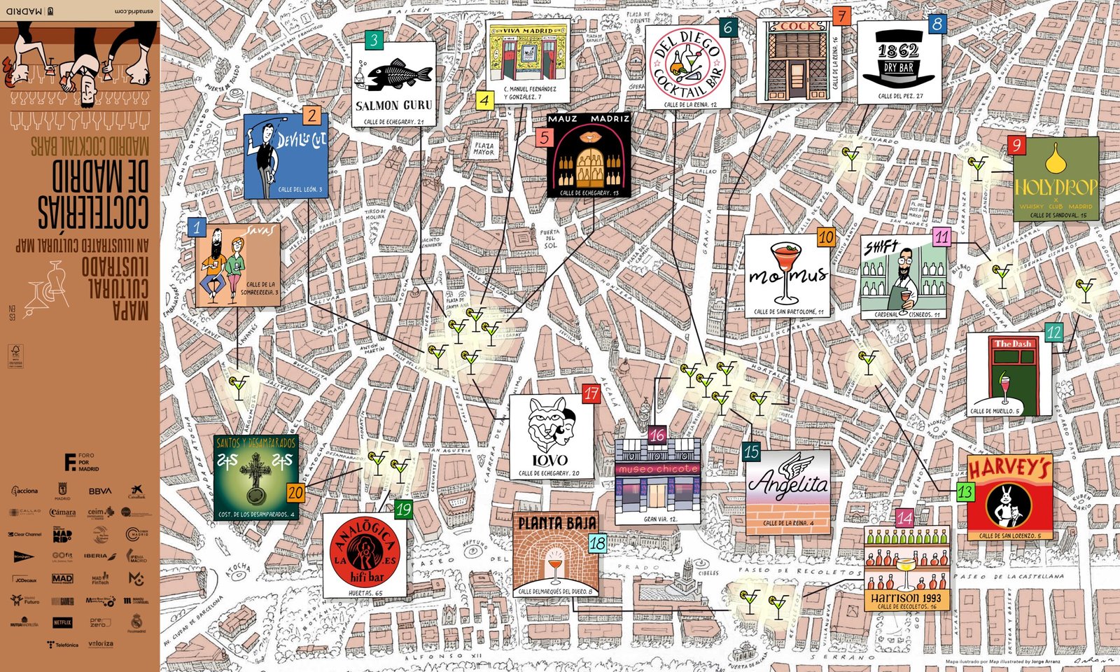 This project is supported by the Forum for Madrid, through the Office of Strategic Projects and Business Participation of the Department of Economy, Innovation, and Finance. The selection of venues has been made by bartender Diego Cabrera, and the texts describing each establishment are written by Miguel Ángel Palomo, a journalist specialized in gastronomy. The illustrations are the work of Jorge Arranz.